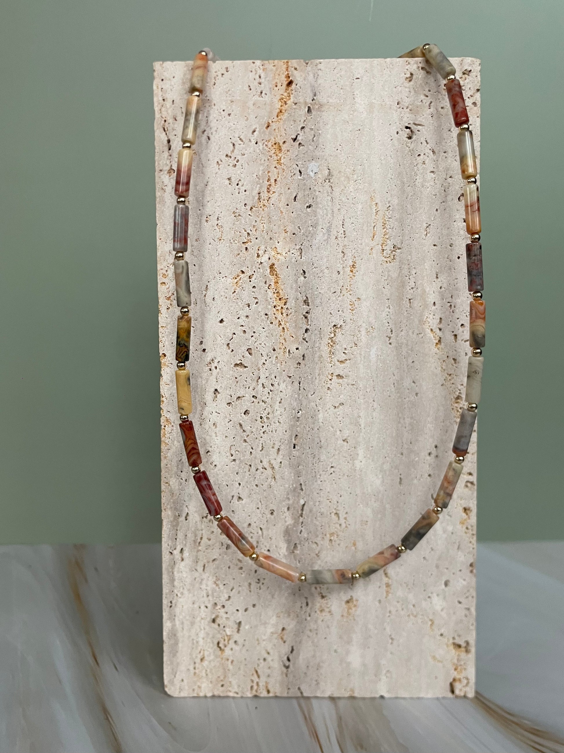- Materials: 4x14mm Crazy Lace Agate Tube gemstones, 14k gold filled 3mm beads with 14k gold filled lobster clasp on a wire string