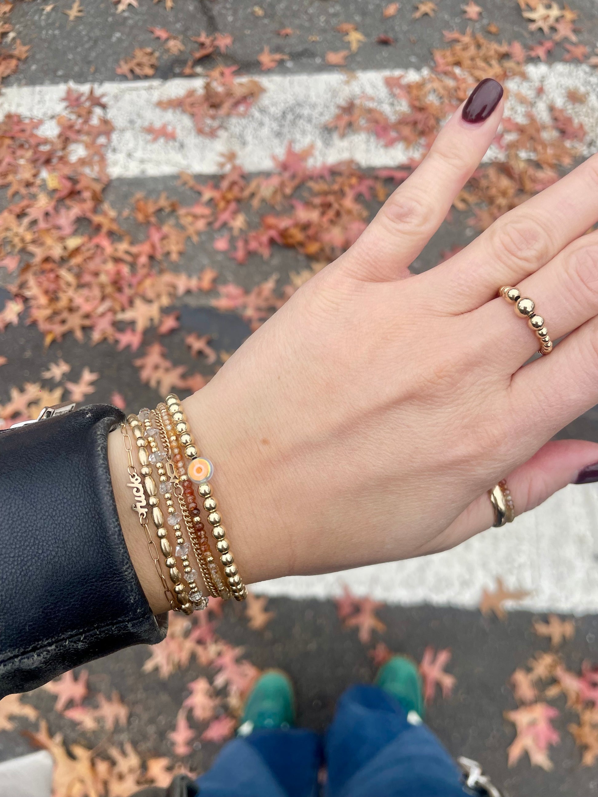 - Care: Piece is waterproof and non-tarnish. It should be stored in a jewelry box or bag when not being worn. Roll on and off to preserve elastic