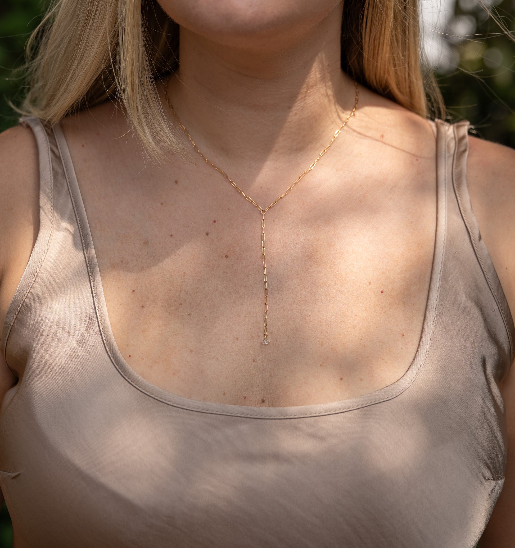 This sleek paperclip chain lariat necklace is finished with a sparkling Herkimer diamond charm, adding a touch of natural brilliance to its modern silhouette. Known for their clarity and high vibrational energy, Herkimer diamonds are said to inspire clarity of mind and amplify intention